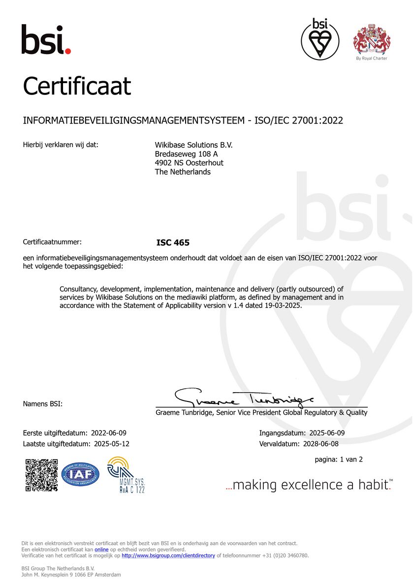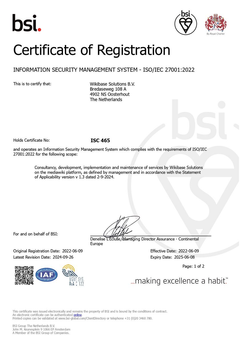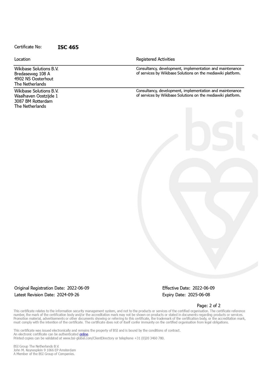 ISO 27001 certificateSince 2022, Wikibase Solutions is certified for information security management systems, by the International Organization for Standardization (ISO). ISO 27001 specifies the requirements for the establishment, implementation, maintenance and continuous improvement of an information security management system (ISMS). It also includes requirements for assessing and treating information security risks, tailored to the needs of the organization. You can validate our ISO 27001 certificate using this link.